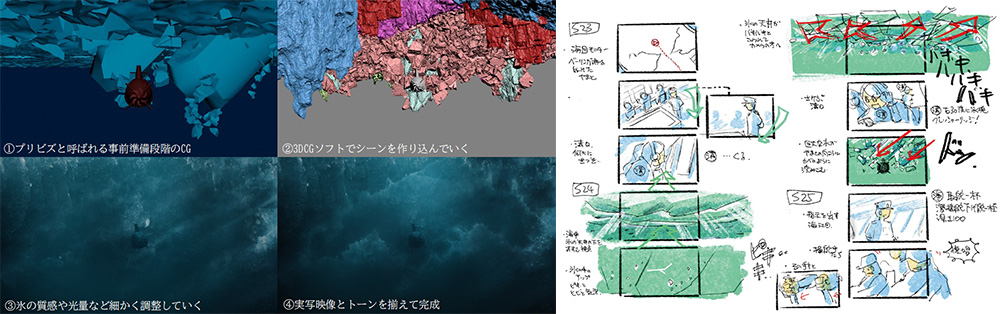 吉野監督の手書きにも熱のこもる本シーン、ストーリーボードには迫りくる氷の脅威に翻弄される〈やまと〉クルーの姿が描かれています。北極の海が徐々に形を成す様が見てとれるメイキングスチールには、細部までこだわり抜かれた緻密なCG表現が凝縮されています。